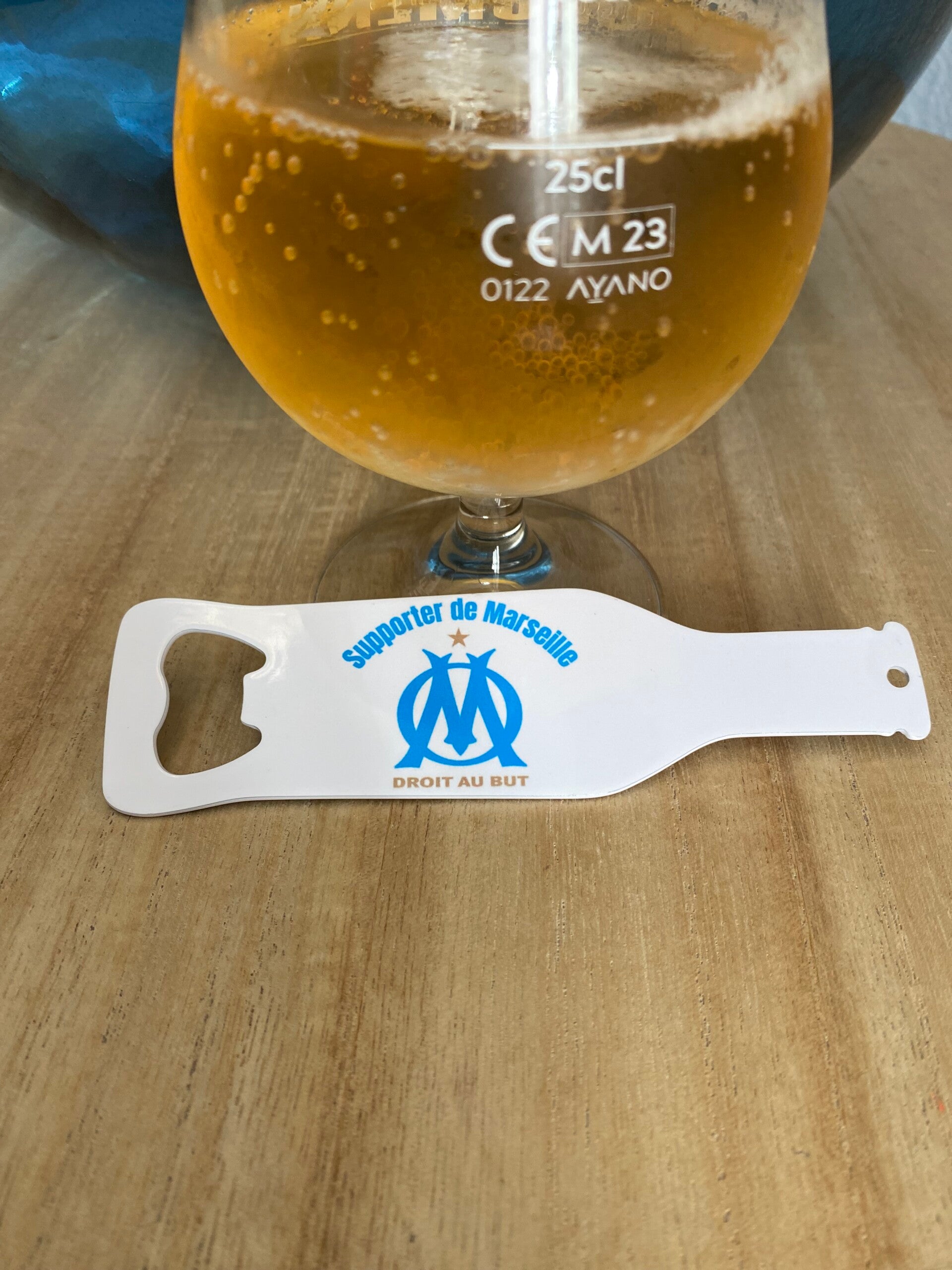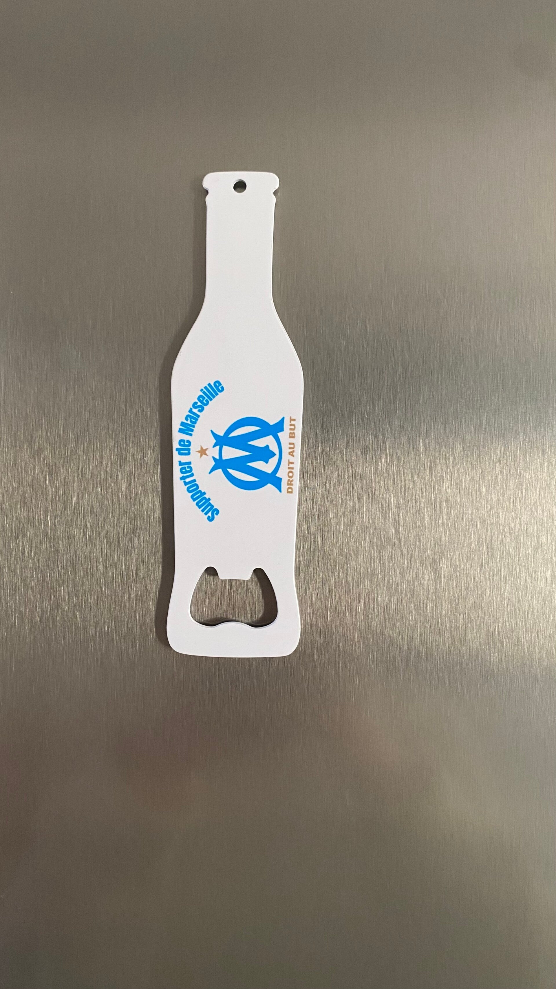 Décapsuleur aimanté logo supporter OM en inox blanc forme bouteilleDimension : 14,1 x 4 cm épaisseur 2mm en inox blanc .